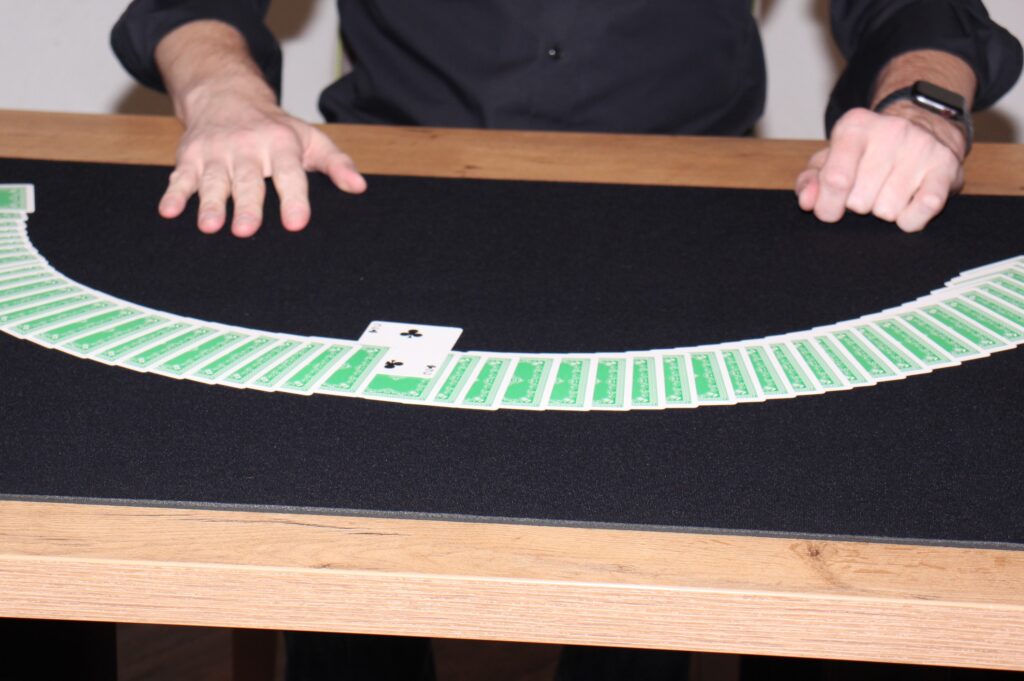Als wir im Februar die Feier vom Dezember ’22 nachgeholt haben (fiel ja wegen Blitzeis damals aus), da begeisterte uns der Zauberkünstler Denis Behr aus München. Und darum haben wir ihn erneut zu unserer Weihnachtsfeier 2023 des Ortszirkels Moosburg-Landshut eingeladen. Er brachte ein Kartenspiel mit, etwas Billardkreide und Herbert, seinen Gummiring-Assistenten. Und damit erlebten wir ein Wunder nach dem anderen… Karten verschwanden, verwandelten sich, wanderten, wechselten die Plätze oder erschienen an frei gewählten Stellen im gemischten Kartenspiel.